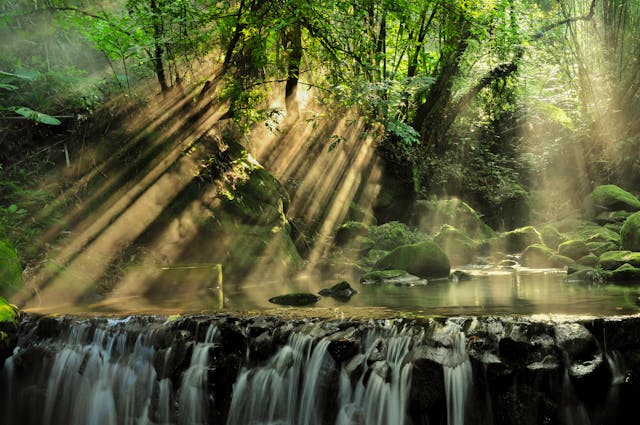 Aujourd’hui, je vous convie à un voyage ascétique vers le Divin, dans son périple délicieux au cœur de l’immensité. Aujourd’hui, les masques tombent, et nous nous envolons dans une nudité totale. Plus besoin de déguisement pour échapper à l’oppresseur ; nous nous offrons corps et âme à ce courant, à cette pluie fine et dorée venue des confins du ciel, qui emplit chaque cellule de notre être de son nectar. Parfois, nous nous sentons en décalage avec ce monde terrestre que nous ne reconnaissons plus. Nos réflexions s’envolent à la lisière de cette forêt, où les arbres se dressent comme des gardiens millénaires. Où sont passés nos rires insouciants d’hier ? Que nous est-il arrivé ? Dans ce temple de la Divinité les ombres dansent, se mêlant aux rayons dorés qui percent la canopée. Ici le silence est sacré, un hymne à l’invisible. Dans ce murmure de l’âme de la nature opulente, la matière sombre, qui naguère nous enserrait, se dissipe peu à peu. Elle se métamorphose en une lumière blanche, pure, bienveillante, et rassurante. C’est comme si l’Univers lui-même nous prenait dans ses bras, nous enveloppant de sa tendresse infinie. Nous ne sommes plus plus seuls, mais partie intégrante de ce grand tout. Les feuilles bruissent, comme des pages d’un livre ancien, où nous pouvons y découvrir notre destinée. Il faut parfois savoir s’accorder aux volontés de l’Univers, se laisser porter par ce grand Architecte des mondes. Dans cette nudité totale, nous sommes libres, délivrés des masques et des entraves. Nos rires insouciants d’hier peuvent résonner de nouveau, mêlés aux chants d’oiseaux, loin des barreaux invisibles de nos pensées, nous comprenons que nous sommes à notre place, ici, au cœur même de l’immensité.